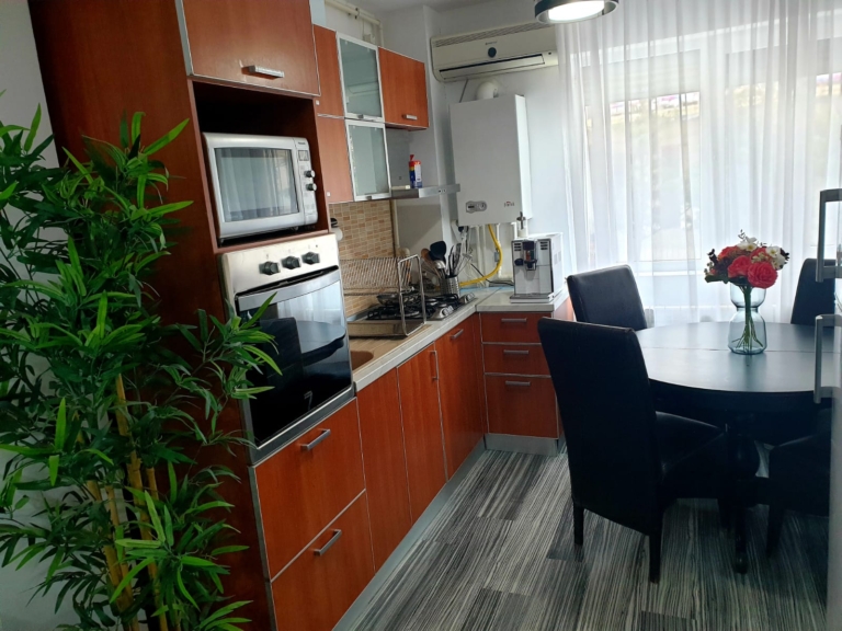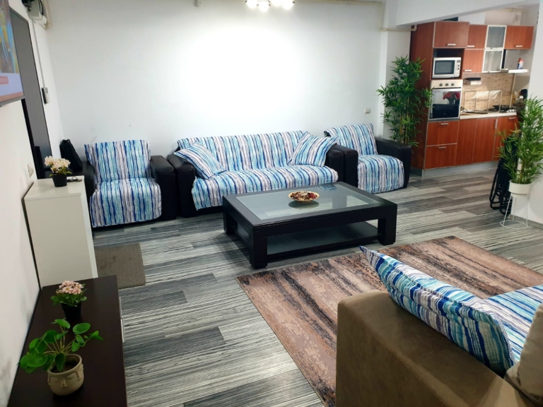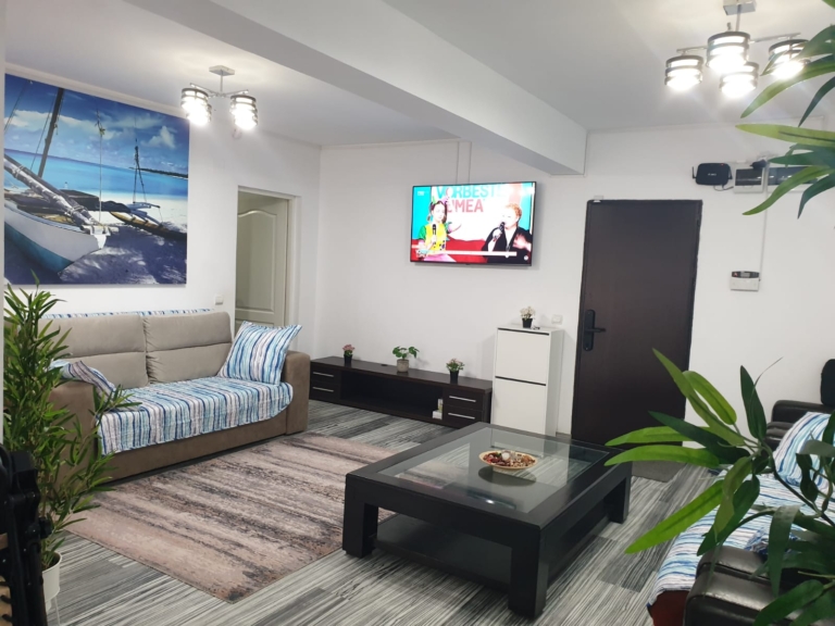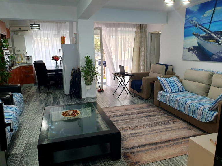 Pe măsură ce intri în apartament, ești întâmpinat cu un spațiu de locuit cald și primitor, mobilat cu gust și decorat cu o temă liniștitoare de coastă. Ferestrele mari din camera de zi oferă multă lumină naturală creând o atmosferă liniștită și senină, care vă va relaxa cu siguranță simțurile.